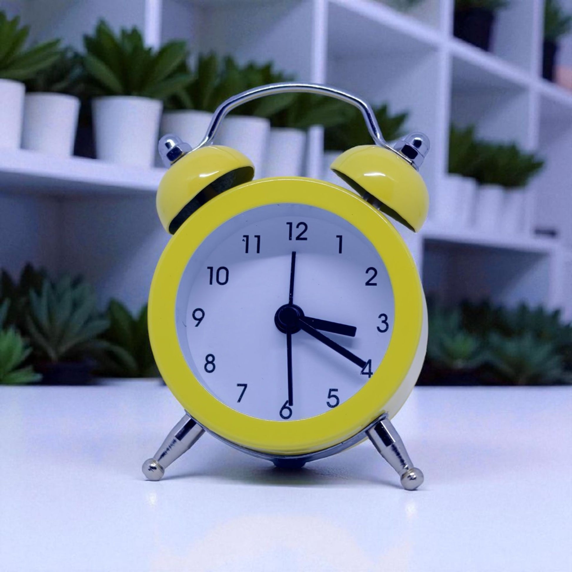 This is a small, classic twin-bell alarm clock featuring a vibrant yellow body and bells. It has a white face with clear black Arabic numerals and black hour and minute hands, which are currently displaying the time as approximately 3:00. The clock has a traditional design with a silver-toned metal handle connecting the two bells and stands on silver-toned metal feet.